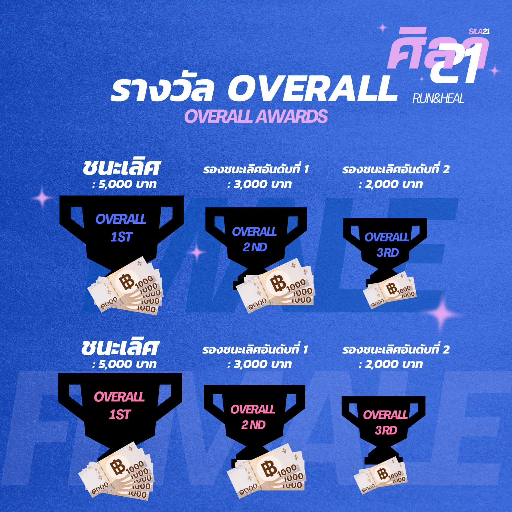 - ถ้วยรางวัล Overall สำหรับที่ 1-3 ชายและหญิง รับถ้วยพร้อมเงินรางวัล 5,000/3,000/2,000 ตามลำดับ