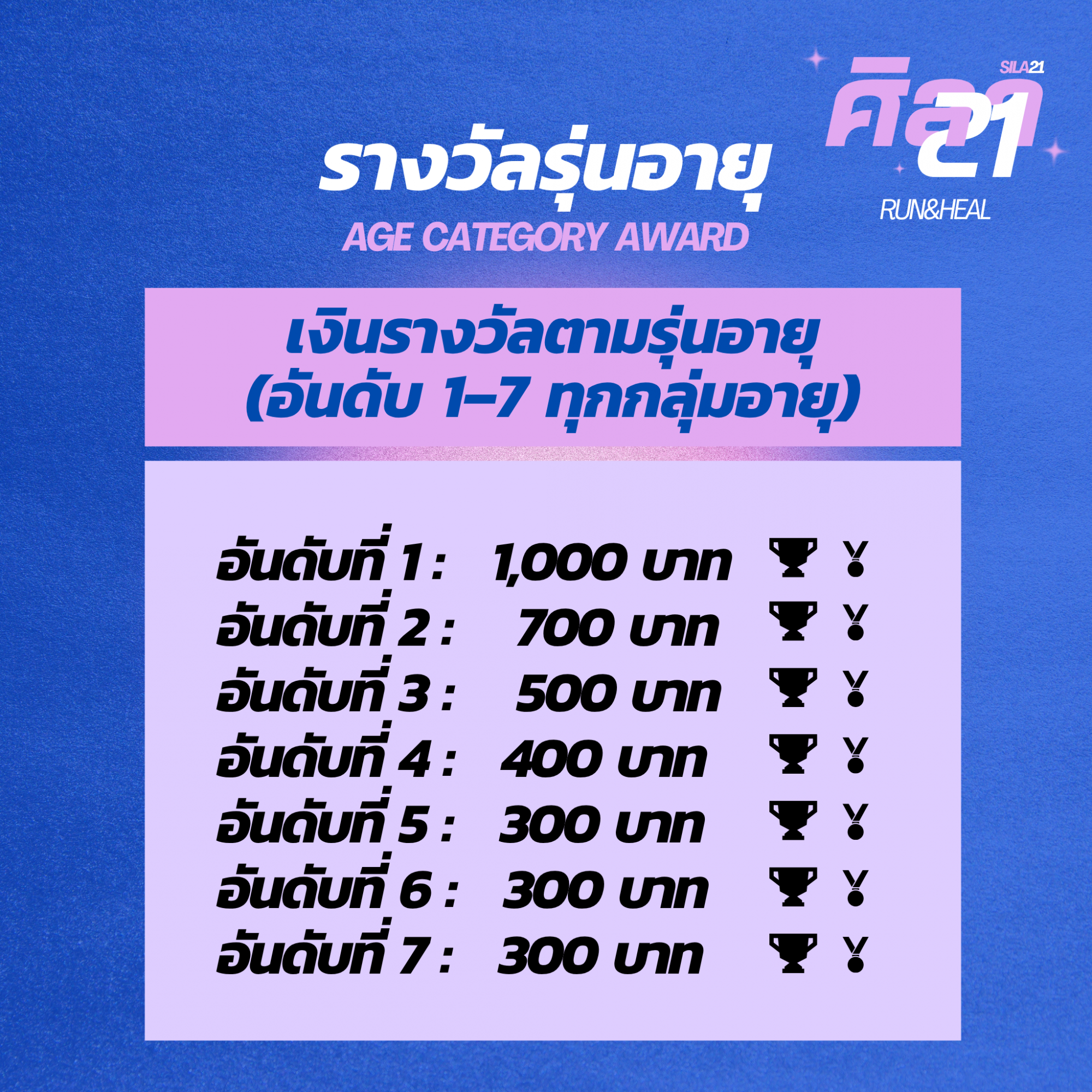 - ถ้วยรางวัลอันดับที่ 1-7 ของทุกกลุ่มอายุ รับถ้วยพร้อมเงินรางวัล 1,000/700/500/400/300/300/300 ตามลำดับ