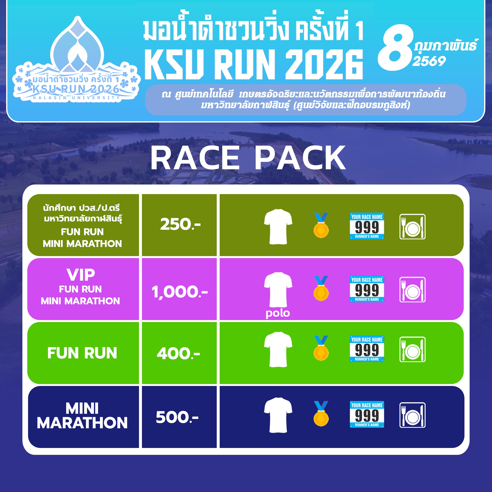 ฟันรัน 5km และ มินิมาราธอน 10km (นักศึกษาของมหาวิทยาลัยกาฬสินธุ์) ค่าสมัคร 250 บาท